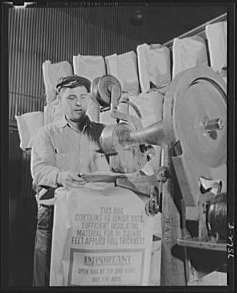 Fiberglass manufacture, Owens-Corning, Toledo, Ohio. A worker in a plant of the Owens-Corning Fiberglass Corporation is packaging bats of lightweight, inorganic, firesafe building insulation. Recent findings by the U.S. Bureau of Mines show that adequate home insulation can save over a billion dollars a year in fuel and release transportation facilities required for the war effort