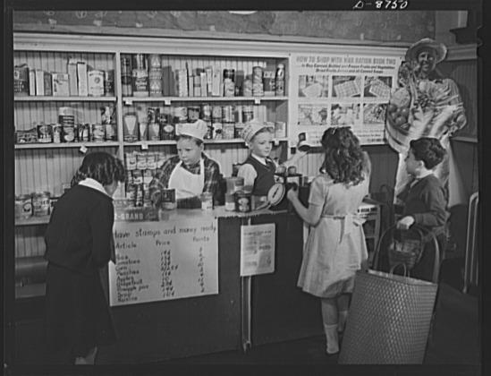 Preparation for point rationing. Buying canned and bottled foods with war ration book two becomes real to pupils in this model store set up in a classroom in the Park View Elementary School, Washington, D.C. Referring to the posted list, pupils learn practical arithmetic when they figure both prices and points