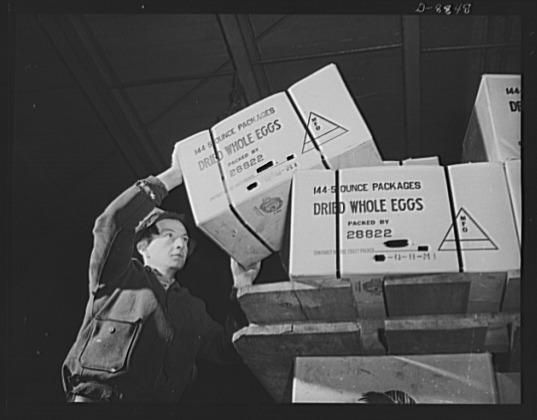 Transportation. Lend-lease shipments. Cases of dried whole eggs, part of a lend-lease shipment, move from a pier to a United Nations freighter that will carry them together with other vital necessities to one of our allies