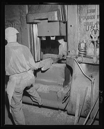 Forging part of small gun. Drop forging a part of one of the smaller guns being turned out in Navy yard. This is part of the war program calling for the completion of hundreds of new warships