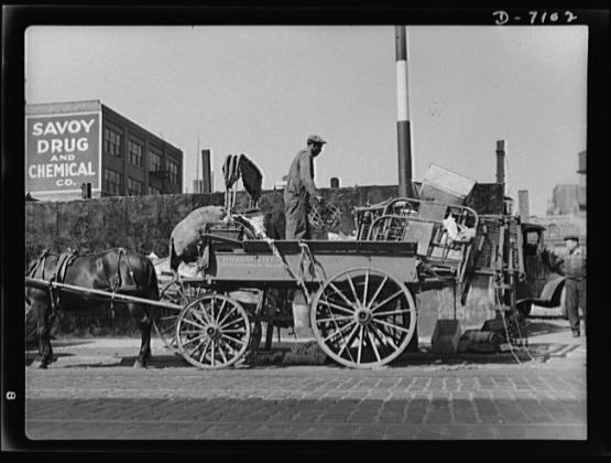 Salvage. Scrap for steel mills. To feed the nation's munitions furnaces, tons of scrap from America's attics and basements are collected every day. Here, a junkman unloads his wagon in a central depot, where the scrap will be segregated and graded for shipment to steel mills