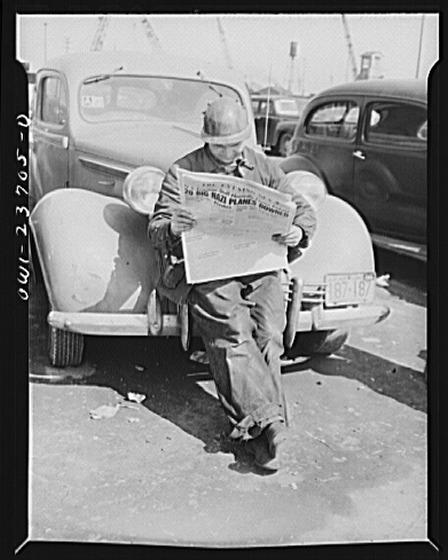 Bethlehem-Fairfield shipyards, Baltimore, Maryland. A worker waiting to go home