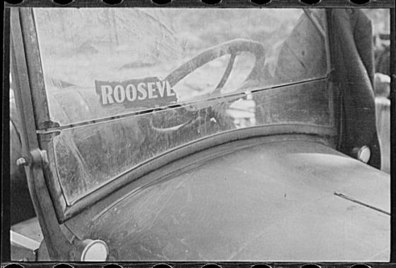 The windshield of a migratory agricultural laborer's car, in a squatter camp near Sacramento, California