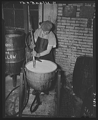 Conversion. Hosiery factory. Permalon solution, a chemical mixture used on mosquito netting is mixed by a worker in a large Eastern mill which formerly made women's stockings. This chemical solution stiffens the netting and prevents subsequent shrinkage, so that the hardest tropical downpour which American armed forces may endure will not alter the netting