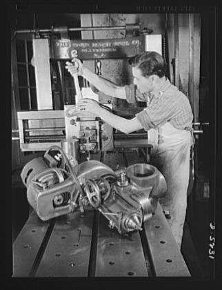 Subcontracting. Passaic home workshop pool. A worker in the Passaic, New Jersey machine shop of the Howe Machinery Company changes a milling head to a planer head on a planing machine, to convert it from production of one type of essential war production to another