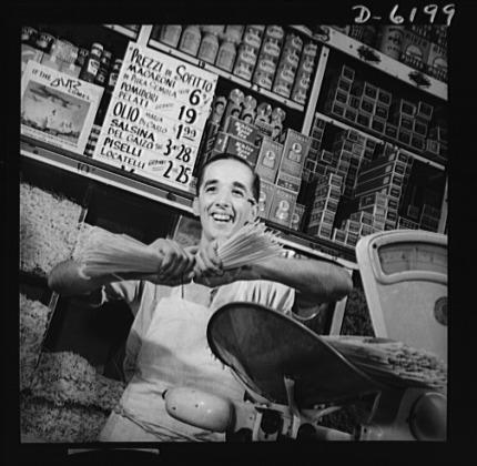 Posting ceiling prices in foreign languages. Charles Ruggiero, clerk in a grocery store in New York's Italian section, wishes the handful of spaghetti he is breaking were Mussolini's neck. The ceiling price sign above his head, written in Italian, is helping to defeat Il Duce by controlling inflation, one of America's most dangerous enemies