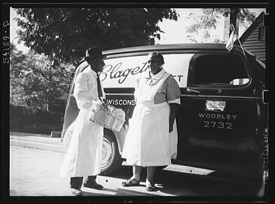 Washington, D.C. A Clagett Market delivery truck in front of a residence where a colored maid and the driver, who is holding a basket of groceries, are talking. A United States Truck Conservation Corps pledge is displayed on the door of the truck