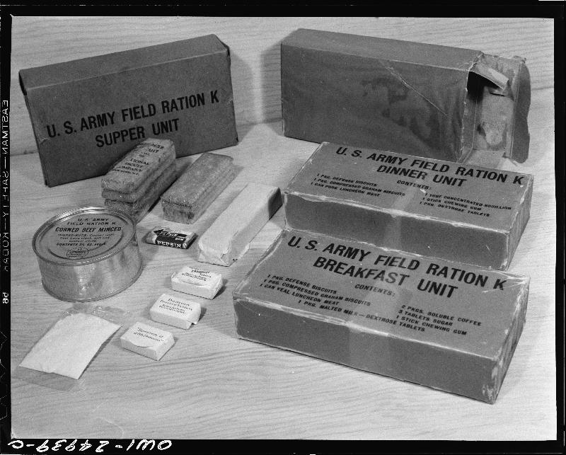 Chicago, Illinois. Subsistence research laboratory of the U.S. Army quartermaster depot. K ration is highly concentrated, and is used only in time of emergency and continuous combat when regular messing facilities are not available. Packed in three boxes for three meals, it weighs only 32.86 oz. and contains 3,726 calories. It is so packed that it will not be affected by temperatures up to 135-F or down to 20 below zero