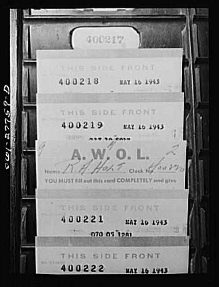 Bell Aircraft Corp., Niagara Falls, New York. Simple device for curbing absenteeism is this AWOL card put up on the board near the time clock
