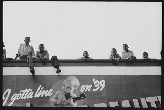 Negro boys atop billboard, National Rice Festival, Crowley, Louisiana