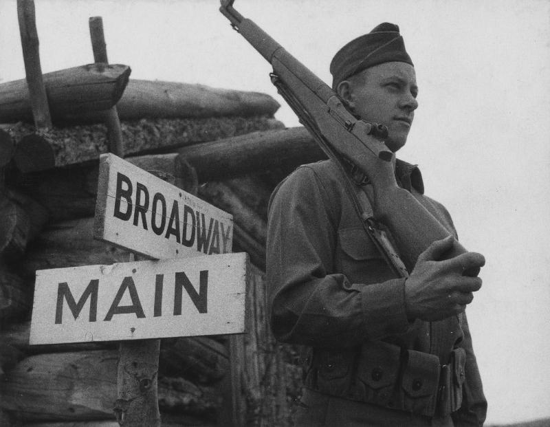Pte. E. Pieper of Wyandotte, Mich., stands guard at Main and Broadway (it says here)