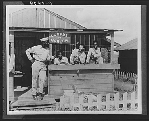 With an airfield security detachment in Hawaii. A touch of humor lightens the hours of the members of an airfield security detachment in Hawaii. Four of them are shown on the porch of "Lloyd's of Harlem," one of the troop barracks