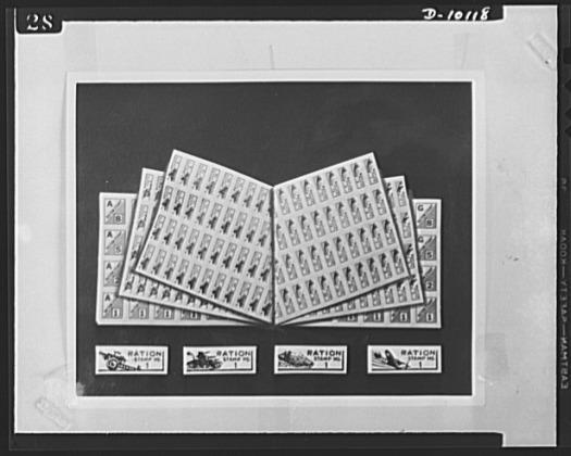 War ration book no. 3. This new ration book, replacement for present books when their stamps are used up, will be distributed during the early summer. It contains four pages of "point" stamps, similar to the point stamps in war ration book 2, though slightly different in design and printed in brown ink. It also contains four pages of "unit" stamps for the type of rationing now used for sugar, coffee, and shoes. Each page of forty-eight stamps bears the design of a different war machine, including guns, tanks, aircraft carriers and planes. One of each of these stamps is reproduced separately below the picture of the book. Important note: Actual dimensions of the point ration stamps are 7/8 inch x 1 inch, while the unit stamps are 7/16 inch x 1 inch. The U.S. Secret Service requests that ration stamps not be reproduced in actual size, but less than 3/4 or over 1 1/2 times. Also, stamps should not be reproduced in color. This photograph, if reproduced, same size, meets these requirements