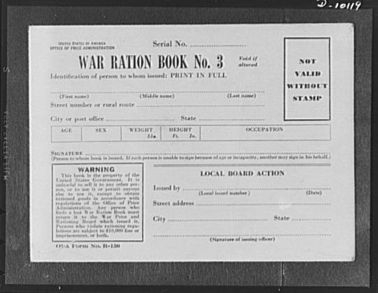 War ration book no. 3. This new ration book, replacement for present books when their stamps are used up, will be distributed during the early summer. It contains four pages of "point" stamps, similar to the point stamps in war ration book 2, though slightly different in design and printed in brown ink. It also contains four pages of "unit" stamps for the type of rationing now used for sugar, coffee, and shoes. Each page of forty-eight stamps bears the design of a different war machine, including guns, tanks, aircraft carriers and planes
