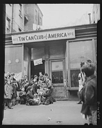 "Boys organize tin club." Group of boys outside the door of the Tin Can Club of America No. 1, in Harlem, New York City. They are holding boxes full of tin-ware
