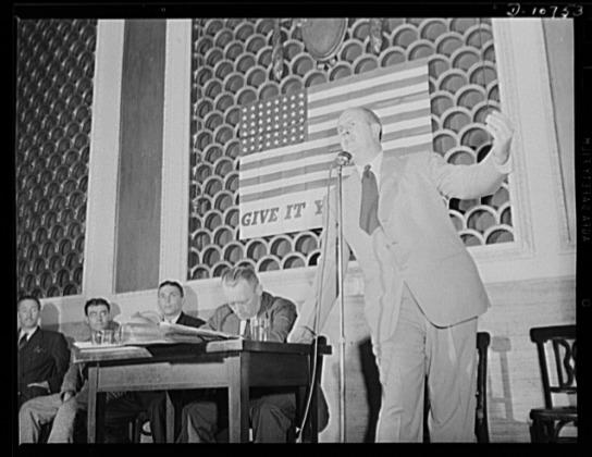 Alex G. Nordholm, Chief, Regional Service, War Production Drive Headquarters, speaking before labor-management committee members at Scranton, July 29th. Seated left to right: Earl Williams, Dmitri Goulandris and Michael J. Kosik