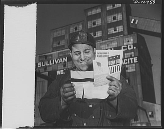 War production drive. Anthracite rallies. Smiling with pleasure, a husky coal miner reads the enclosure with his pay check that shows him how he is helping to win the war. He extracts anthracite, or hard coal, from an Eastern Pennsylvania mine