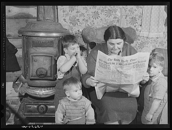 Mrs. Arthur Brown with three of her children reading Bath Daily Times. The husband works at the shipyard. After having been away from Bath for five years returned for the "Boom." Rents were too high in town and so they started building a place for themselves about five miles out of Bath on land belonging to their brother. Husband has been working a week on and a week off. One of the children is old enough to go to school but it is too far out of the way for the school bus to stop for him