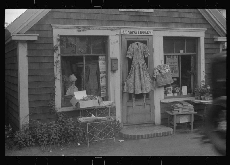 Shop front. Note dress on door which is "Provincetown dress," local specialty much favored by tourists, almost never worn by Provincetowners. Provincetown, Massachusetts