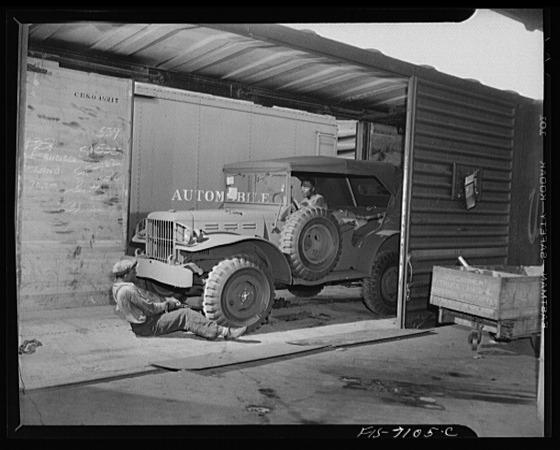 Chrysler Corporation. Dodge truck plant. Detroit, Michigan (vicinity). Loading a Dodge Army truck onto a freight car