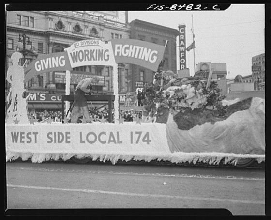 Detroit, Michigan. Float in the Labor Day parade showing soldiers and worker