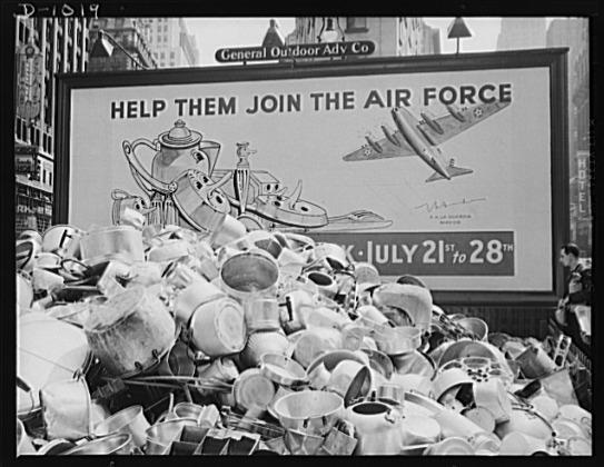 Aluminum collection. A store window display in New York, New York, promoting the National Defense Aluminum Collection (July 21-29, 1941). This collection was conducted by the Office of Civilian Defense and some of the aluminum obtained will be for use in industries producing for national defense. Much of the lower grade aluminum collected which cannot be used directly for this purpose will be used to replace new aluminum in the manufacture of consumer goods, and hence release this new aluminum for use in defense production