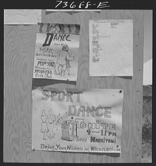 Nyssa, Oregon. Sign for the dance which was given by a local Japanese farmer for the evacuated Japanese-American farm workers who live at the FSA (Farm Security Administration) mobile camp