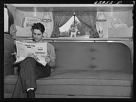 Jack Cutter, who came from Fort Worth, Indiana for work in General Electric plant, in his trailer at FSA (Farm Security Administration) camp. Erie, Pennsylvania