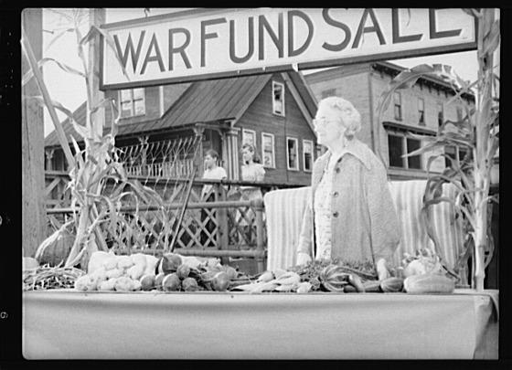Hardwick, Vermont. Mrs. Alice White at the Victory Store vegetable counter selling donated farm produce, the money from which will go to the war fund
