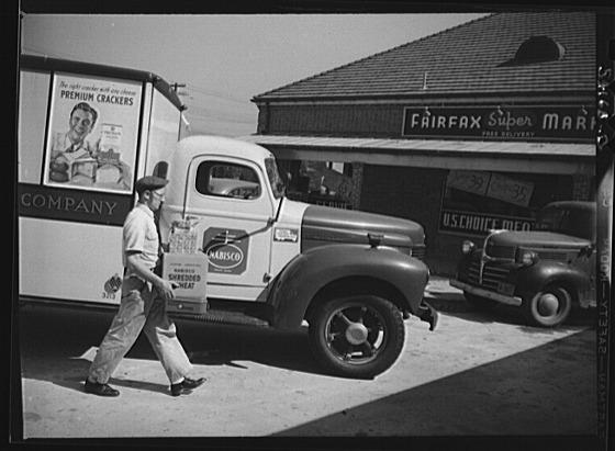 Fairfax, Virginia. A Nabisco truck on the door of which is displayed a United States Truck Conservation Corps pledge. The driver is taking a box of packaged goods into the Fairfax supermarket