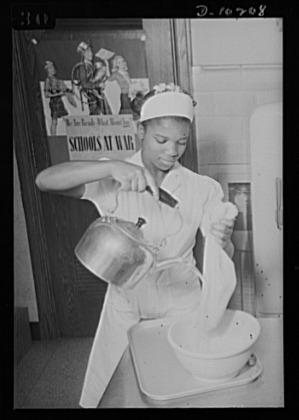 Washington public schools go to war. The public schools of Washington, D.C., like those in most other sections of the country, have revised their curricula to fit the pupils for fuller participation in the war effort. They have gone all-out for the Program of Civilian Defense and at the Margaret Murray Washington Vocational School, courses in home-making and the preservation of foods are now taught all young women. Photo shows Miss Elizabeth Wood blanching carrots to loosen skin for removal