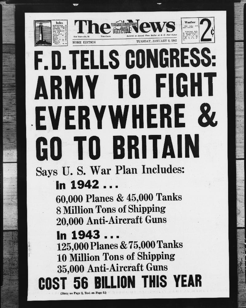 Newspaper headline from The News: "F.D. Tells Congress: Army to fight everywhere & go to Britain"