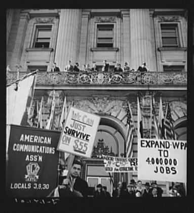 In front of city hall, San Francisco, California. The Worker's Alliance, Works Progress Administration (WPA) organize simultaneous demonstrations in the large cities of the nation cut in the relief appropriation by the United States Congress
