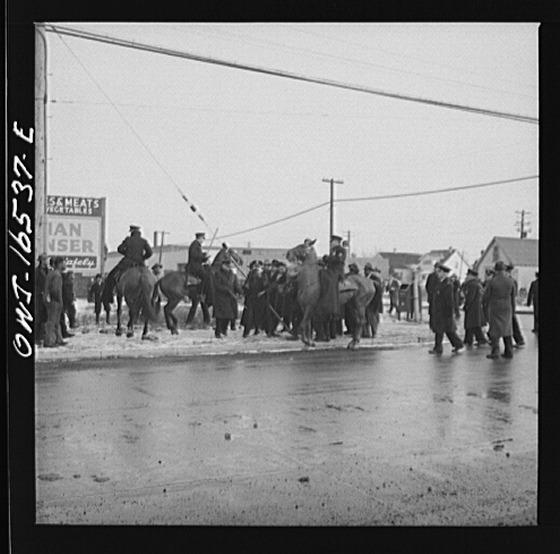 Detroit, Michigan. Riot at the Sojourner Truth homes, a new U.S. federal housing project, caused by white neighbors' attempt to prevent Negro tenants from moving in. Mounted police moving a group of Negroes