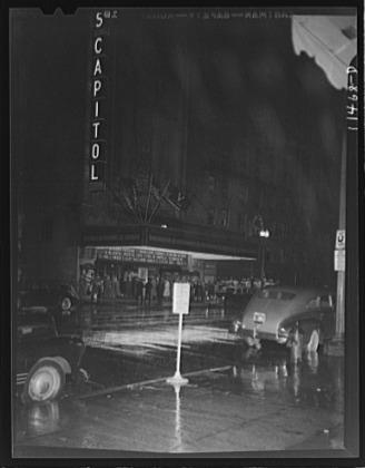 Washington, D.C. People waiting in line on a rainy night on F Street to enter the Capitol Theatre