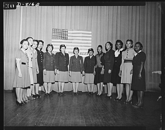 New recruits of WAACS sworn in. Part of a class of sixteen young women sworn into the Women's Army Auxiliary Corps by Major Ina M. McFadden, recruiting officer for the Washington Military District, Thursday evening, January 7, at a public ceremony at the Cordoza High School. Those sworn into the Women's Army Auxiliary Corps and now awaiting call to active duty are: Misses Neppie Stoker Anderson, Joye Pamela Arnold, Elizabeth Orlean Garrett, Juanita Greene, Elsie Givens, Farieta Hall, Lillie B. Harrison, Marie Humphrey, Nancy McCall, Evelyn F. Overton, Isabelle Peterson, Mittie Lee Thomas, Grace Elizabeth Thompson, Jeanne Cecelia Webster, Catherine Geneva Brown and Ernestine Louise Woods. A drive for 150 Negro recruits from the Military District of Washington is now in progress, Major McFadden announced