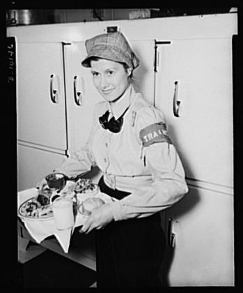 Emmy Banys, welder-trainee at General Motors' Eastern Aircraft Division in Linden, New Jersey, holds the forty-seven-cent Victory lunch which is served daily in the plant cafeteria. Including a small steak, two vegetables, salad, enriched breads, custard and a glass of milk, this type of nutritious lunch is providing war workers with the energy needed to maintain full production