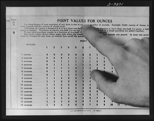 When the weight of a rationed product does not come out to even pounds, the point fraction table at the bottom of the official consumer table show point values for ounces. If the odd weight comes out to a fraction of a point, a retailer can collect an extra point if it is a half point or more. But if it is less, the customer does not need to give up an additional point