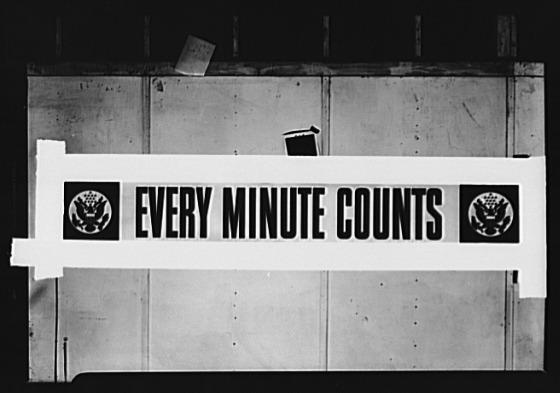 Every minute counts. A three-color (red, white and blue) poster designed and produced by the Division of Information, Office of War Information (OWI), for display in war plants throughout the nation