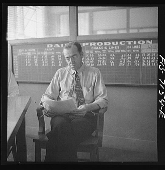 Detroit, Michigan (vicinity). Chrysler Corporation Dodge truck plant. Production supervisor discussing daily production at production meeting