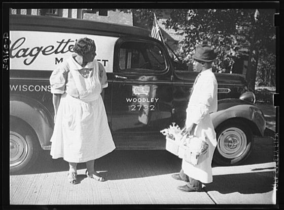 Washington, D.C. A Clagett Market delivery truck in front of a residence where a colored maid and the driver, who is holding a bag of groceries, are looking at the United States Truck Conservation Corps pledge displayed on the side of the truck