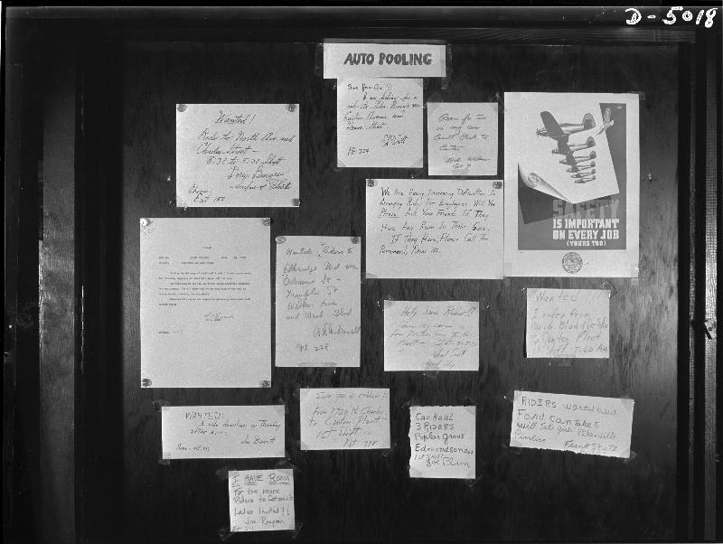 Transportation. Car pooling at Glenn Martin. On the "auto pooling" bulletin board in the Glenn Martin aircraft plant, car owners willing to carry extra passengers list information on their routes and destinations