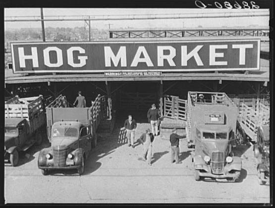 Farmers unloading hogs at stockyards. Denver, Colorado