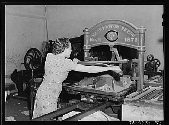 Editor of the Valley News operating hand press. Browns Valley, Minnesota