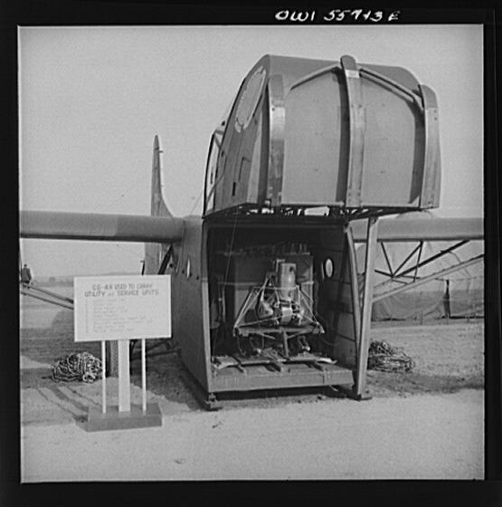 Glider used to carry utility and service units. Shown at demonstration of equipment held by United States Army Air Forces. Cargo space is large enough to hold a jeep and six men or a 75mm pack Howitzer, with crew