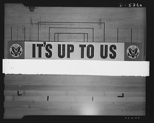 War production drive streamer. Streamer displayed in war plants by the War Production Board (WPB). The original is 10 feet, 2 inches wide and 16 3/4 inches high and is painted in red and blue. Copies may be obtained from the Distribution Section, Office of War Information (OWI), Washington, D.C.
