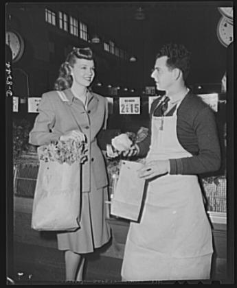 "I'll carry mine." Betty Jane Rhodes, popular Paramount Pictures star, shops and carries her own parcels, patriotically cooperating with the "I'll Carry Mine" Campaign, sponsored by the Office of Defense Transportation to save vital delivery equipment for essential war uses