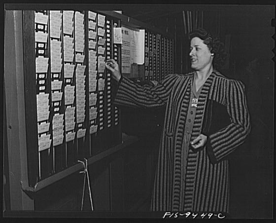 De Soto bomber plant. Detroit, Michigan. Typical woman war worker reaching for a time card