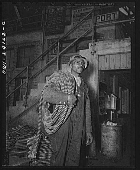 Baltimore, Maryland. Building the SS Frederick Douglass. More than 6,000 Negro shipyard workers are employed at the Bethlehem-Fairfield shipyards where the Liberty ship is being rushed to completion. The noted orator and abolitionist worked as a ship caulker in the vicinity of this yard before he escaped from slavery. James Bibons, soldier in the battle of production, carrying insulated electric cables for engine room