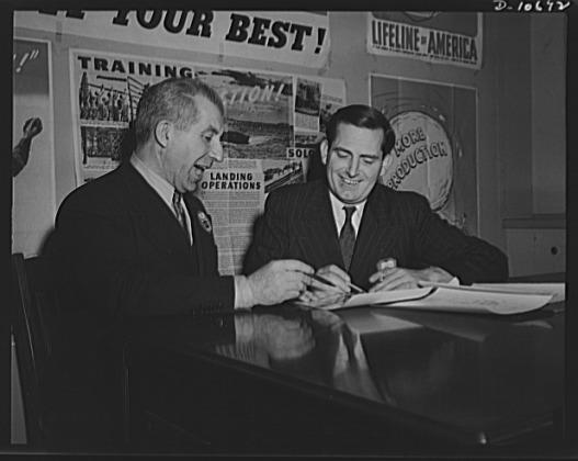 Feiner wins Individual Production Merit Certificate. Samuel Mayer Feiner (left), Certificate of Individual Production Merit winner from San Francisco, California, explains his prize-winning suggestion to William E. Warne, acting chief of War Production Drive Headquarters in Washington. Feiner, 50-year old American citizen of Polish birth, devised an elbow-edging machine which tripled the production of elbows at the Bethlehem Steel Company's shipbuilding division. It saves over 1,000 man hours monthly. Feiner was one of 22 men throughout the nation who received certificates in the September judging by the Board for Individual Awards of the War Production Drive Headquarters
